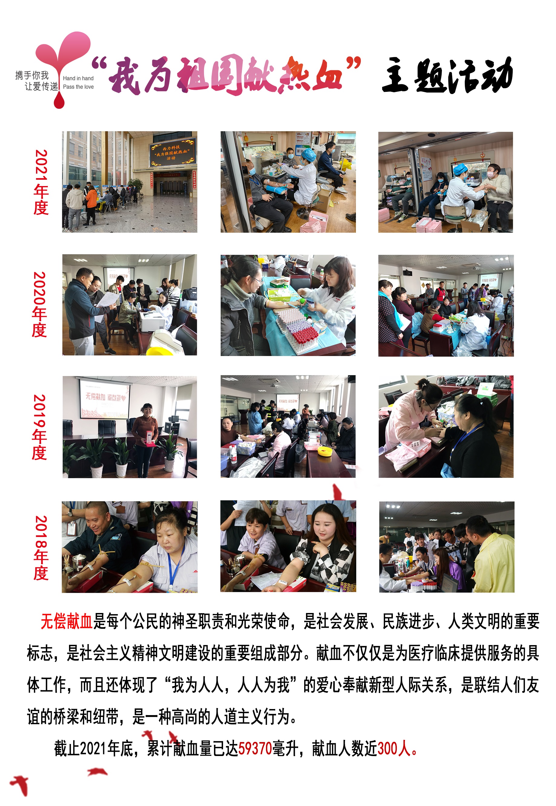 截止2021年底,累計獻血量已達59370毫升,獻血人數近300人。